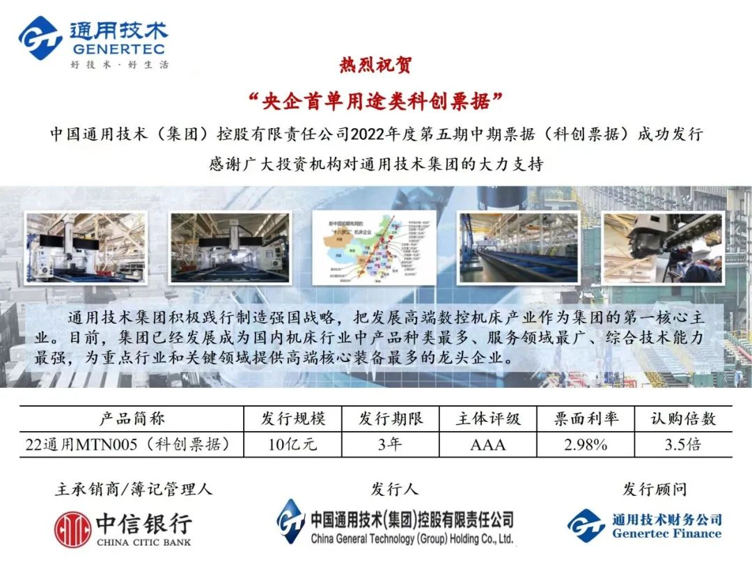 6月23日,央企首單用途類科創票據成功落地——通用技術集團2022年第五期10億元中期票據(科創票據)在銀行間市場發行,期限3年,票面利率2.98%,募集資金將用于向沈陽機床(集團)有限責任公司進行增資,助力該公司重點解決復合材料等關鍵零部件加工和核心功能部件研發等相關科創項目發展。