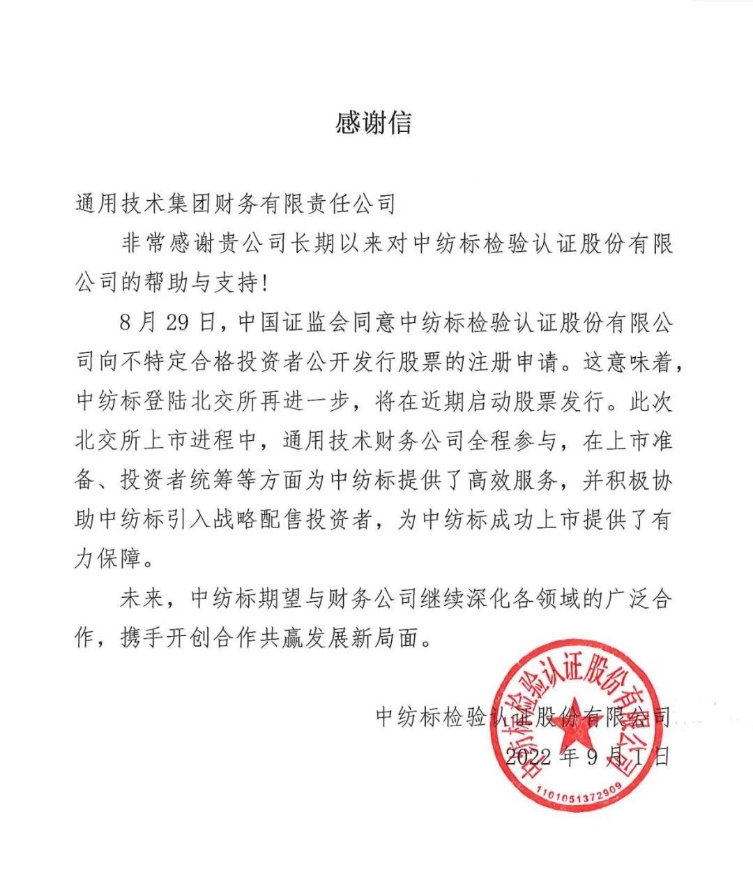 通用技術(shù)財務(wù)公司助力中紡標成為紡織檢驗檢測領(lǐng)域北交所第一股